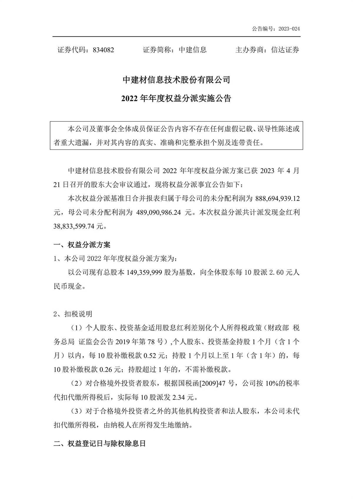 中建信息2022年年度權(quán)益分派實施公告
